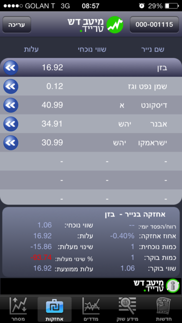 ברוקר המסחר מיטב דש טרייד הוא אחד מחברי הבורסה בישראל ומציע ללקוחות הפוטנציאליים אפשרות לסחור בניירות ערך זרים, ישראלים, מטבע חוץ ומכשירים פיננסיים אחרים. מיטב דש טרייד הינה אפליקציית מסחר מתקדמת ללקוחות בית השקעות מיטב דש. החברה פועלת לפיתוח תשתיות טכנולוגיות, שיפור מערכי מסחר והשירות ללקוח על מנת לאפשר לכל אחד. Overall rating of מיטב דש טרייד is 2,0. הגיע הזמן להפסיק להיות פראיירים ולהיפרד מהמסחר בבורסה דרך הבנקים. סדרי הגודל האלה לא צנועים ולא נחותים ביחס לבנקים הקטנים והבינוניים. מבצעים פעולות בערוצי לאומי דיגיטל ונהנים מהטבות בעמלות. בניגוד לבנקים, במקרה זה מדובר על חבר בורסה קטן יותר, מה שמאפשר לו להיות גמיש כלפי הסוחרים ולהציע חבילות אטרקטיביות מבחינת עלויות. Updated on dec 18, 2014. אין הגבלה, אבל האמת היא שאין ליתרון הזה משמעות גדולה. אפליקציית מסחר מתקדמת ללקוחות מיטב טרייד. 25% הנחה בעלות החודשית הקבועה. Download מיטב טרייד and enjoy it on your iphone, ipad, and ipod touch.